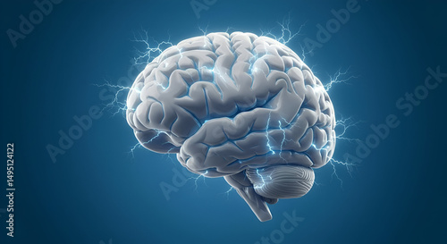 3D model of a human brain with electrical stimulation in a medical illustration. Anatomical structure of the brain with glowing energy.