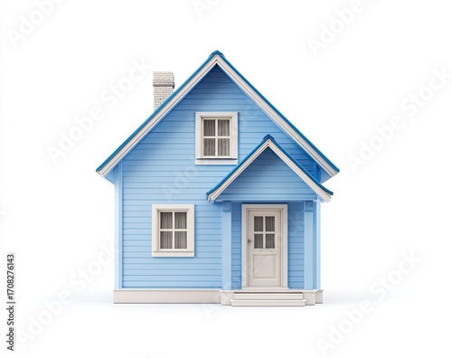 3D model of a light blue house, simple design, small size, front view, isolated on white background