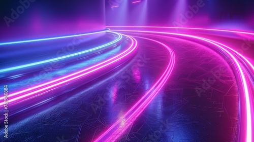 3D neon light effect background. A high speed road is reflected in the curved beam of purple and blue neon.