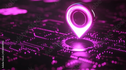 3D neon location pin icon on a digital map background, with glowing light effects and bokeh, symbolizing navigation, geolocation, and digital mapping technology.