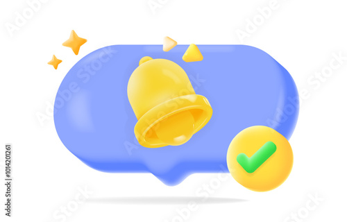 3d Notification bell icon with a checkmark in a blue speech bubble, representing alerts or reminders. illustration vector