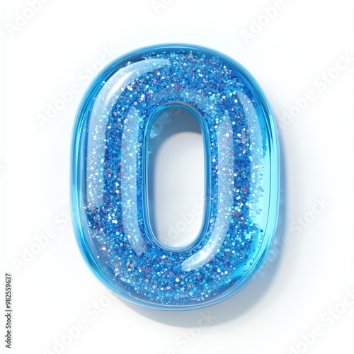 3D number 0 with blue liquid with glitters in glass number texture realistic modern design, soft lighting, white background.