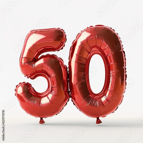 3D number 50 with Shaped red Foil Balloons realistic modern design, soft lighting, bright white background