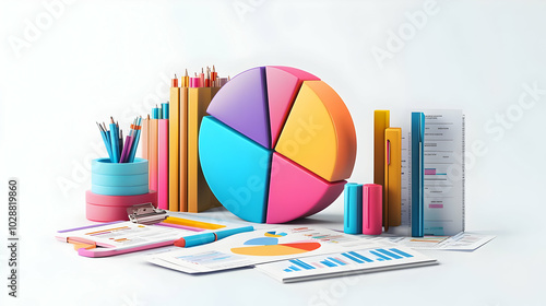 3D Pie Chart Icon with Business Documents - Vector Illustrating Data Analysis and Budget Distribution on White Background for Corporate Finance and Analytics