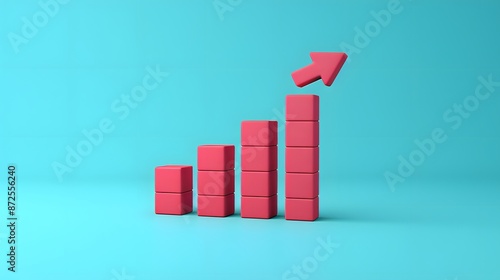 3D Pink bar graph on blue background showing growth with upward arrow. Concept of business success, progress, and data analysis.