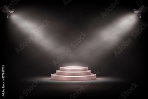 3d podium, round platform stage and spotlights, empty realistic pedestal with steps