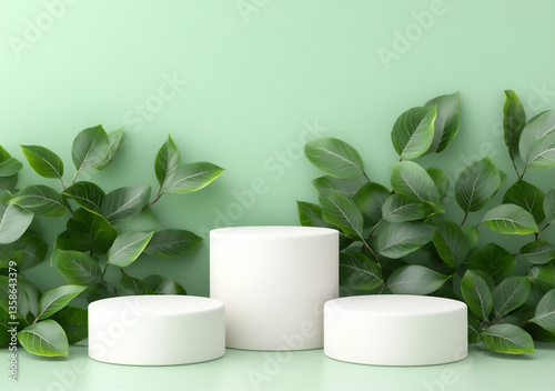 3d podiums in light green pastel colors for product presentation with a nature leaves background, vector illustration, 8k render, high resolution, high details,