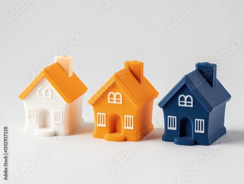 3D Printed Miniature Houses in Vibrant Colors on White Background