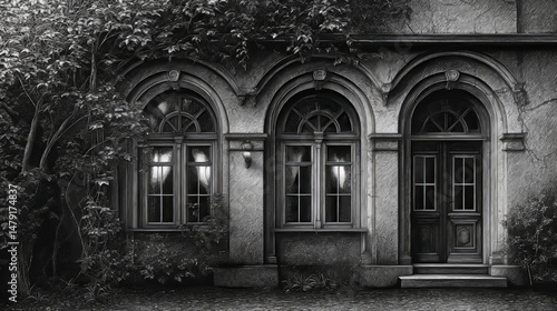 3d realistic vector icon illustration. Old mansion arch window frames in black and white.