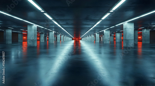 3D Render - Empty Underground Parking Garage with White Lights and Red Reflections