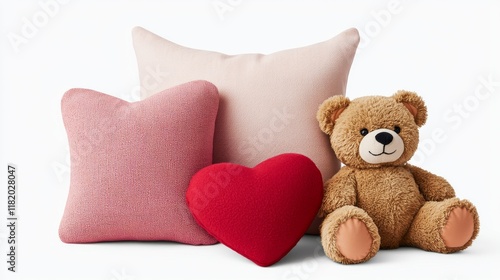 3d render A cozy arrangement of decorative pillows and a teddy bear, perfect for a warm, inviting atmosphere.