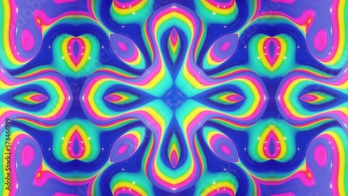 3d render. Abstract background simmetrical 3d liquid pattern with bright gradient color transition. Liquid kaleidoscope with viscous liquid waves and glitter on surface. Wavy rainbow pattern
