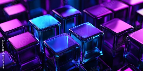 3D render, abstract geometric background with blue and purple glass squares on a black backdrop