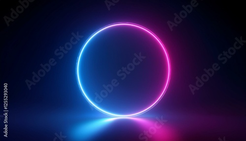 3d render, abstract neon background with fluorescent ring, blank round frame. Simple geometric shape. Laser line glowing with pink blue light