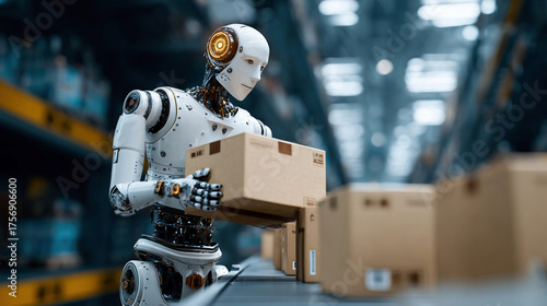 3D Render: Autonomous AI-Enabled Humanoid Robot Working at Fulfillment Center. He is Sorting Packages and Moving Boxes