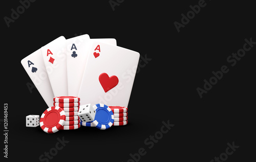 3d render falling Poker chips and playing cards in the air. Online gambling