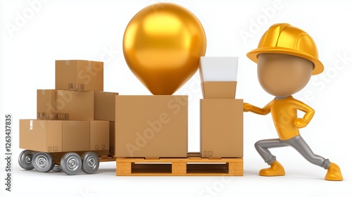 3D Render Gold Attire Worker Moving Cardboard Boxes on Pallet Near Golden Sphere