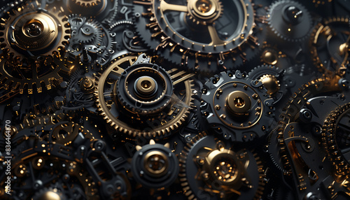 3d Render Illustration Of A Steampunk Mechanism: Gears, Flying Metal Spheres, And Gold Rings In Engine Mechanical Parts.
