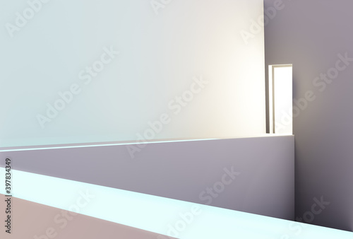 3D render illustration of abstract space with door and staircase with podium, stand, corridor, geometric objects.