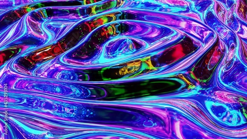 3d render. Liquid pattern like waves. 3D stylish abstract iridescent bg of wavy surface like brilliant liquid glass with rainbow beautiful gradient colors. Trendy colorful fluid