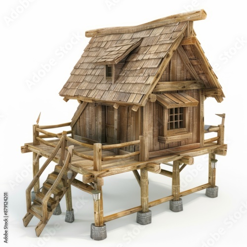 3D Render, Low Poly style of a medieval fisherman's hut, on isolated white background, Generative AI