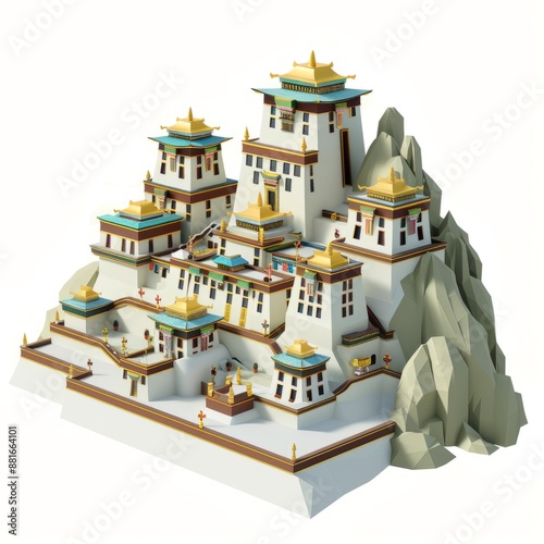 3D Render, Low Poly style of a Tibetan monastery, on isolated white background, Generative AI