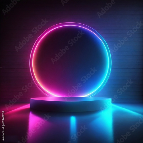 3D Render. neon product podium or pedestal with sunlight and shadow on white block wall; natural texture background for product presentation, promotion, scene,3D rendering product display platform