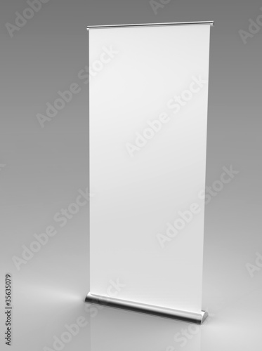 3d render of a blank roll up banner on a grey background