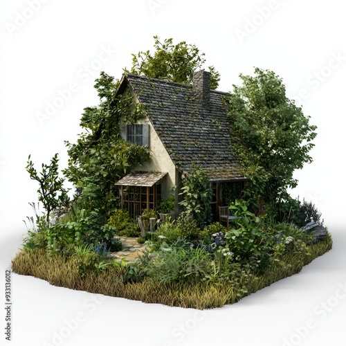 3D Render of a peaceful herbalist's cottage surrounded by medicinal plants, on isolated white background