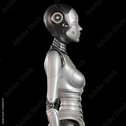 3d render of a very detailed robot woman or futuristic girl, side view of the upper body isolated on black background
