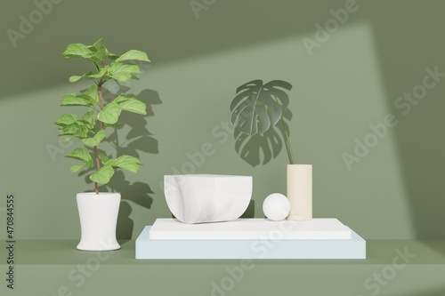 3d render of abstract pedestal podium display with Tropical Monstera leaves. Product and promotion concept for advertising. Green natural background.