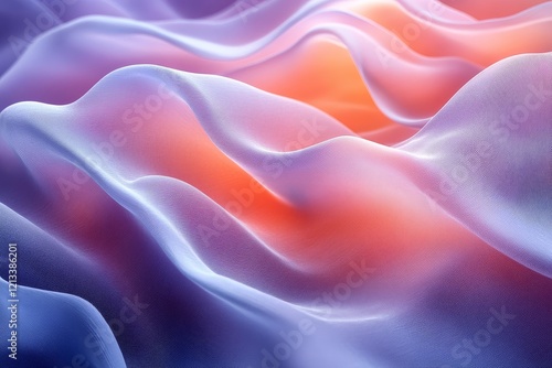 3D render of an abstract pastel-colored wave shape with silk cloth on a white background, soft blurred light blue and purple background, studio shot with high detail.