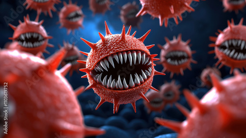 3D render of angry red bacteria with sharp teeth attacking in dark environment. fierce appearance of these microorganisms evokes sense of danger and aggression