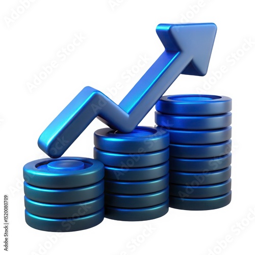 3d render of blue upward arrow on stacks of coins isolated on white background