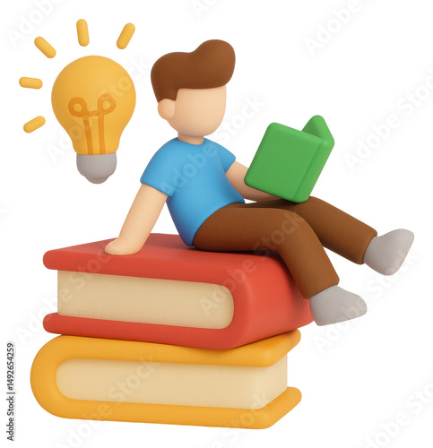 3D Render of Boy Reading Book on Stack of Books with Lightbulb, Education Concept