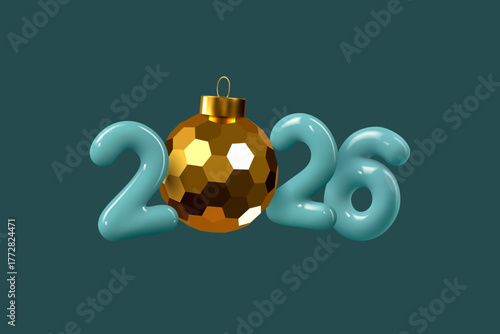 3D render of glossy turquoise 2026 numbers with golden reflective Christmas ornament in the center. Modern festive composition symbolizing New Year celebration and elegant holiday design. Vector