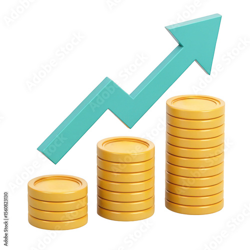 3d render of growing gold coin stacks with upward arrow isolated on transparent background