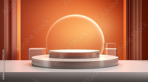 3D Render of Minimal Orange Background with Podium Stage and Glowing Neon Light Ring for Product Presentation, Modern and Sleek Design