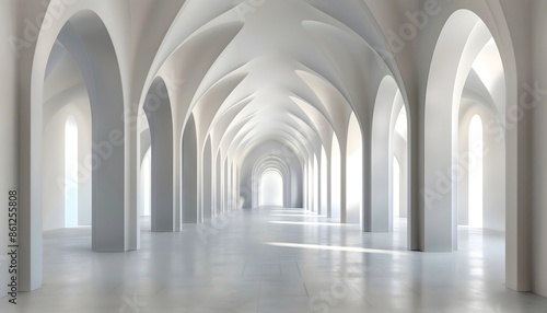 3d render of white arches backdrop, with long corridor in the center, perspective view, soft light, neutral colors, minimalistic