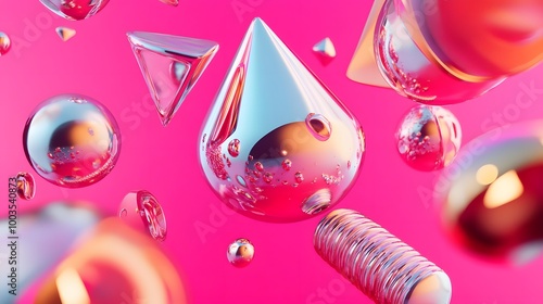3d render realistic primitives composition. Flying shapes in motion isolated on pink background. Abstract theme for trendy designs. Spheres, torus, tubes, cones in metallic blue and pink colors.