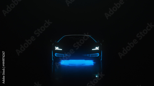 3d render sports car with neon lights goes to the camera on a black background