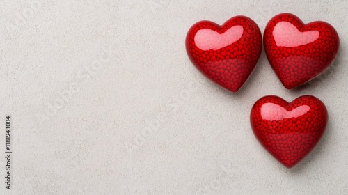 3d render Three glossy red hearts are placed on a soft surface, symbolizing love and affection in a simple yet elegant arrangement.