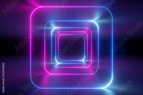 3d render, ultraviolet neon light, tunnel, corridor, rounded square frame, abstract background, virtual screen, space portal, virtual reality environment, pink blue red spectrum, laser show