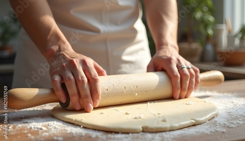 3D rendered artistic hands rolling out pizza dough with rolling pin, flour dust floating in air