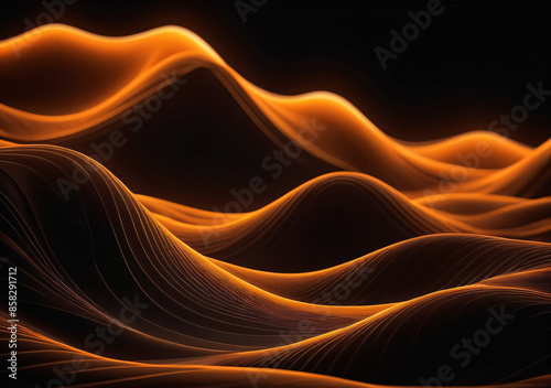 3D rendered landscape of orange waves with glowing edges on a dark background. Digital art of orange wave made from lines with black background. Futuristic and abstract concept.