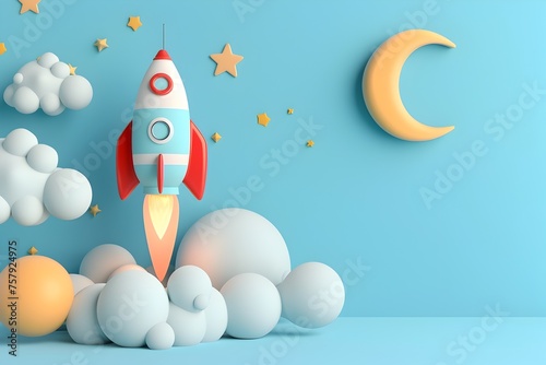 3D Rendered Moon with Whimsical Rocket