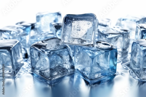 3D rendered transparent ice cubes with water droplets, highlighting the beauty and clarity of frozen water. Generative Ai