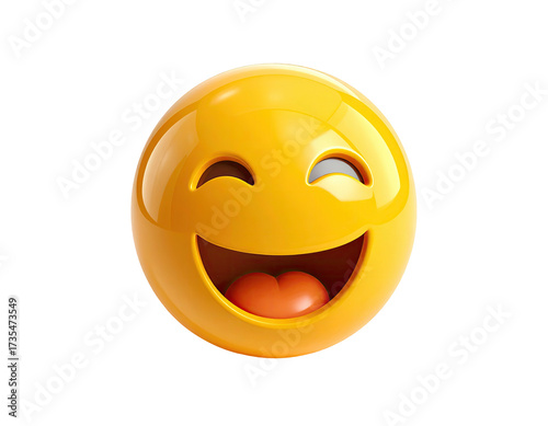 3D rendered yellow smiley face with wide open laughing mouth, closed eyes