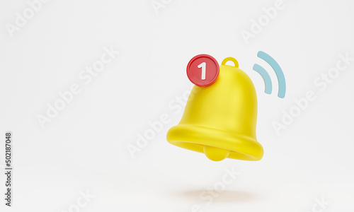 3D rendering, 3D illustration. Yellow notification bell is ringing with one new notification on white background. Minimal social media element.
