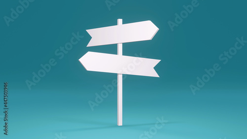 3D rendering concept of travel vacation. Direction empty blank sign with white arrows on post isolated on blue background. 3D Render.